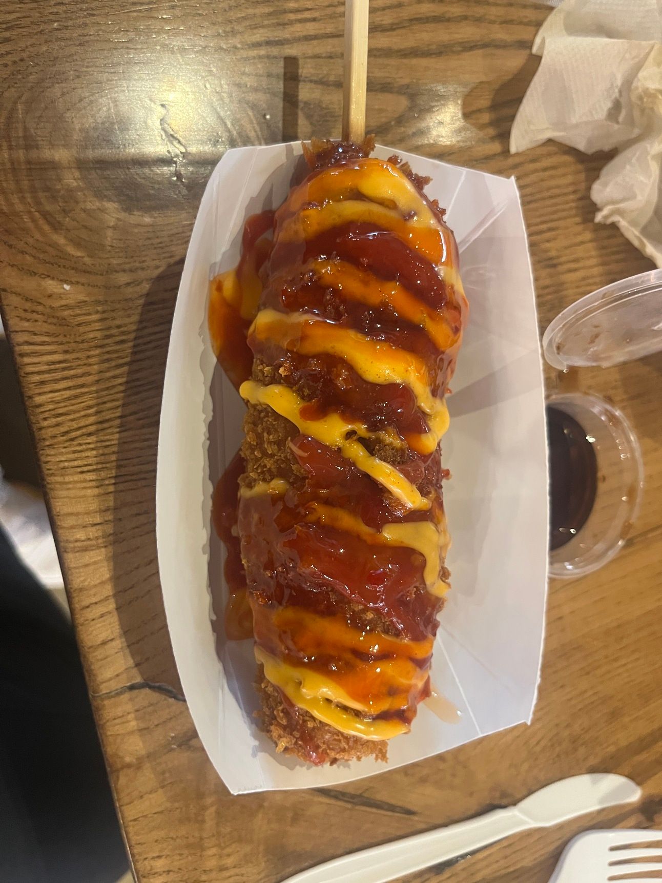 K-Dog with about 5 different types of hot sauce